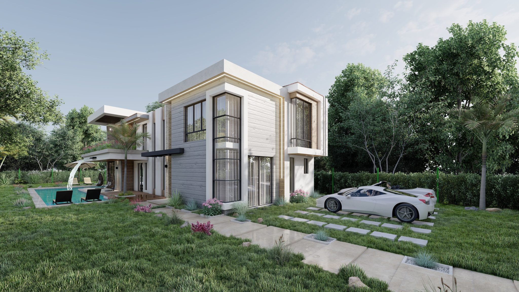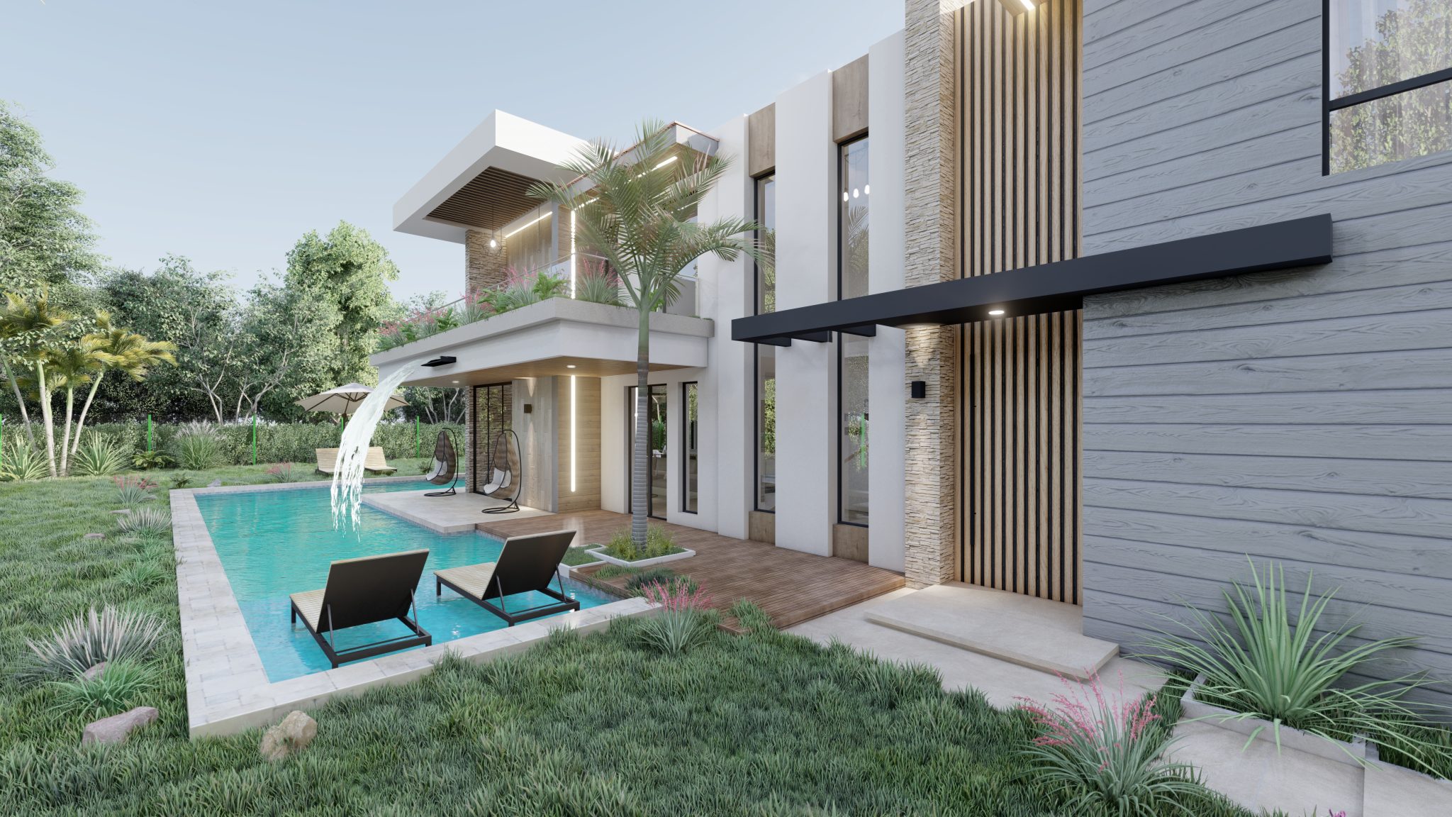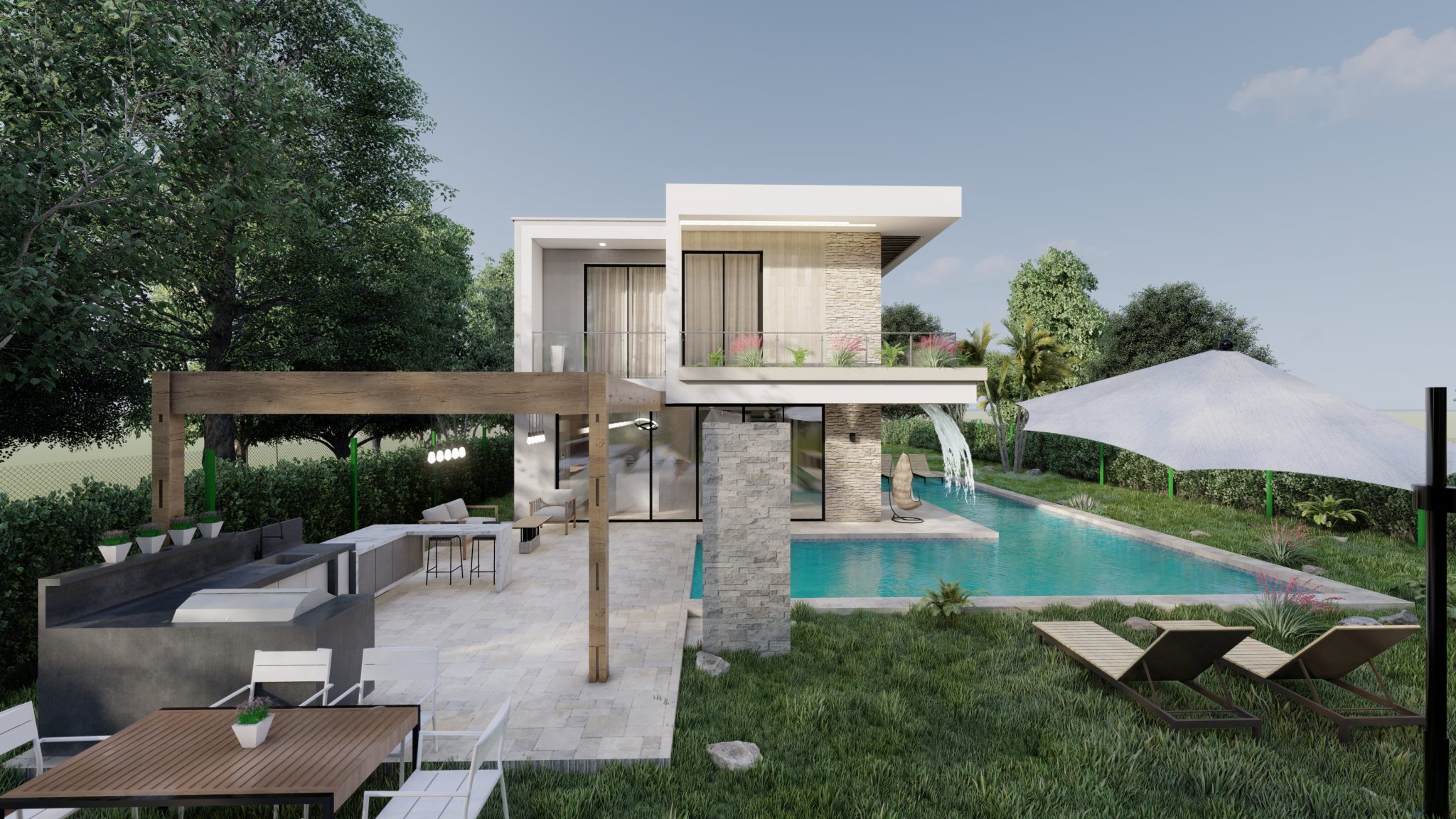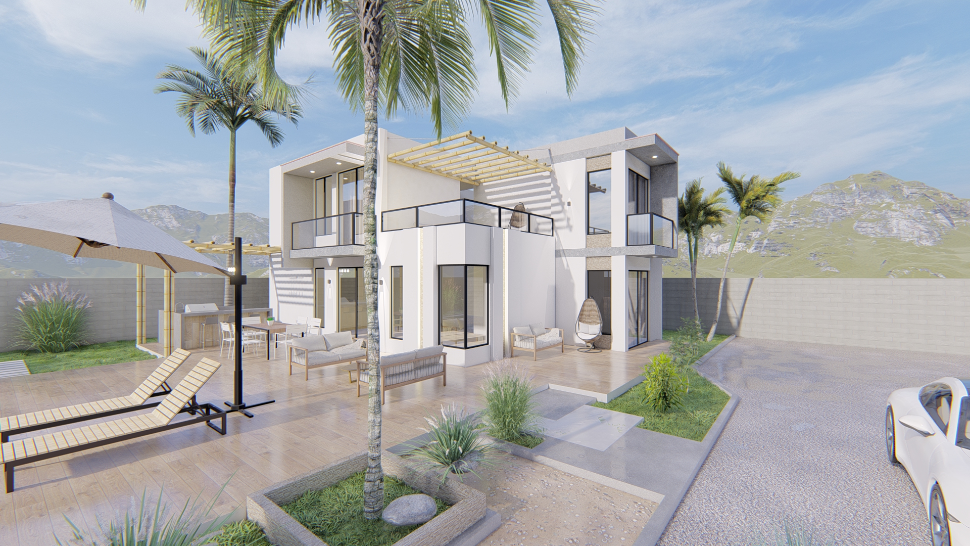 Inspirada en estilos contemporáneos y funcionales, este proyecto unifamiliar presenta una volumetría clara con grandes ventanales que integran las vistas exteriores con las interiores, donde la zona social se ubica en el 1er nivel con la finalidad de aprovechar las vistas panorámicas del entorno, VILLA VALENCIA es una propuesta de diseño que fue elaborada con un diseño estratégico teniendo en cuenta la rotación del sol, la utilización de los materiales de la zona y la funcionalidad.