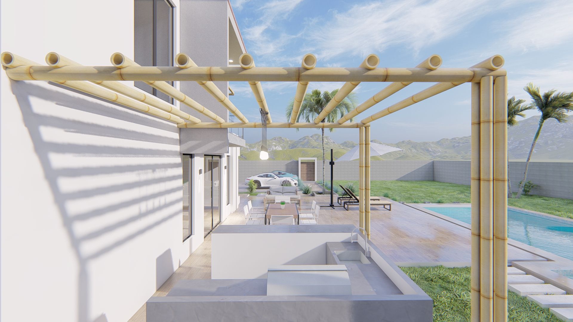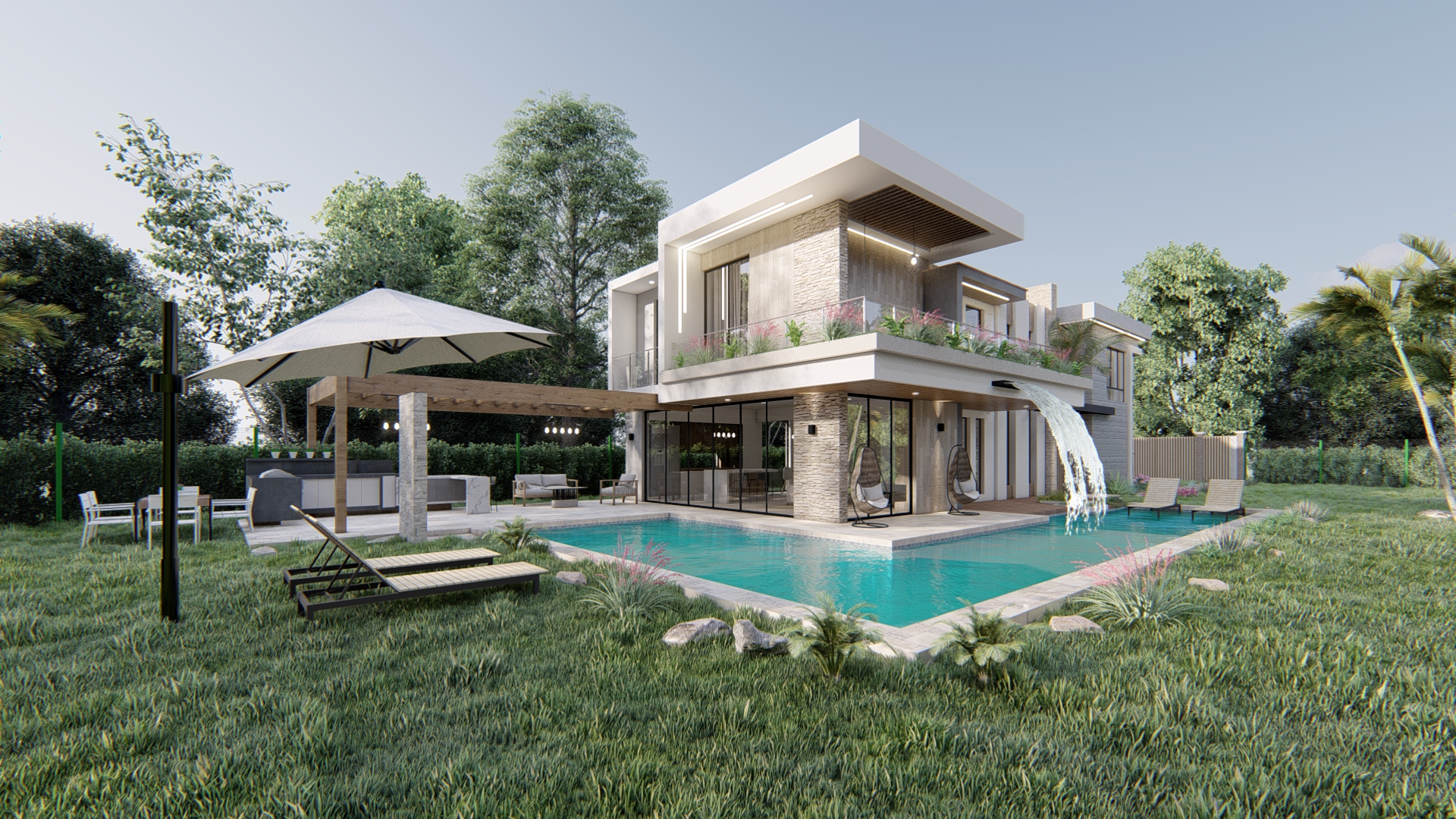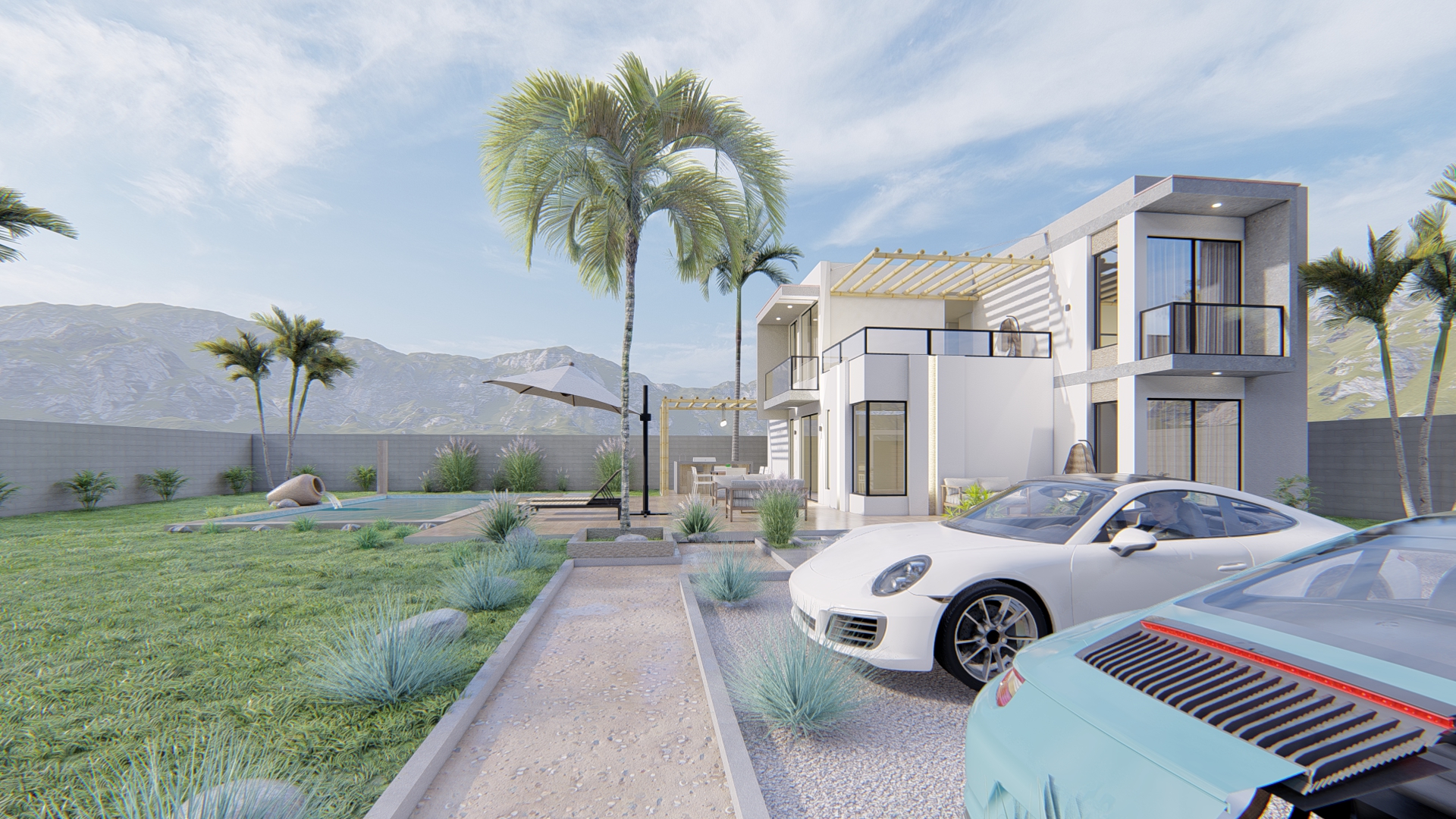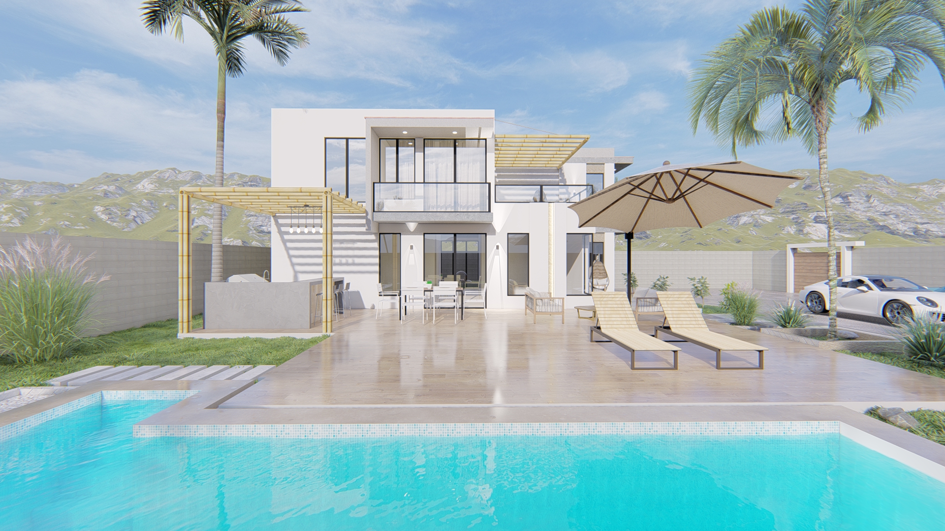 Inspirada en estilos contemporáneos y funcionales, este proyecto unifamiliar presenta una volumetría clara con grandes ventanales que integran las vistas exteriores con las interiores, donde la zona social se ubica en el 1er nivel con la finalidad de aprovechar las vistas panorámicas del entorno, VILLA VALENCIA es una propuesta de diseño que fue elaborada con un diseño estratégico teniendo en cuenta la rotación del sol, la utilización de los materiales de la zona y la funcionalidad.