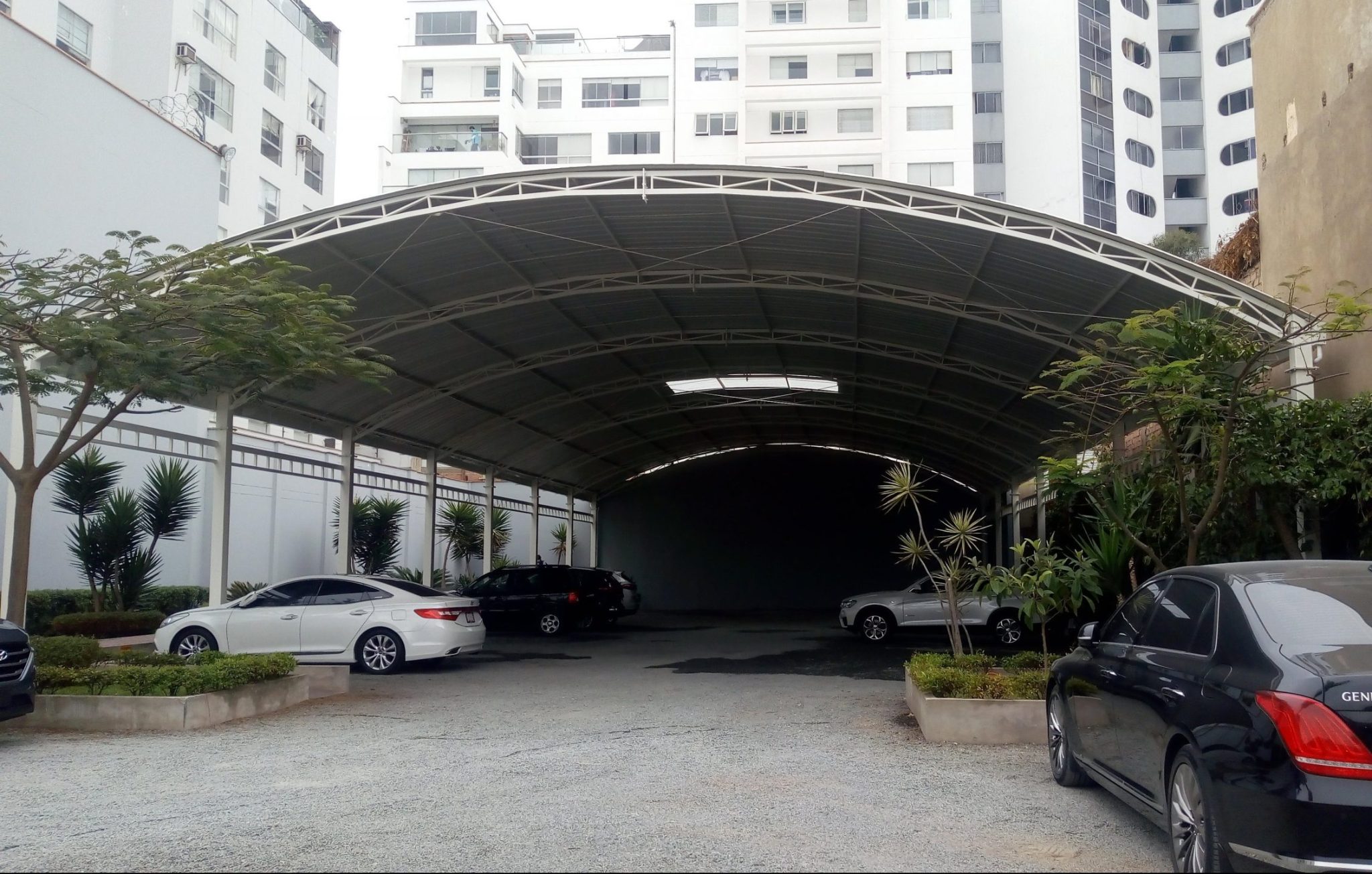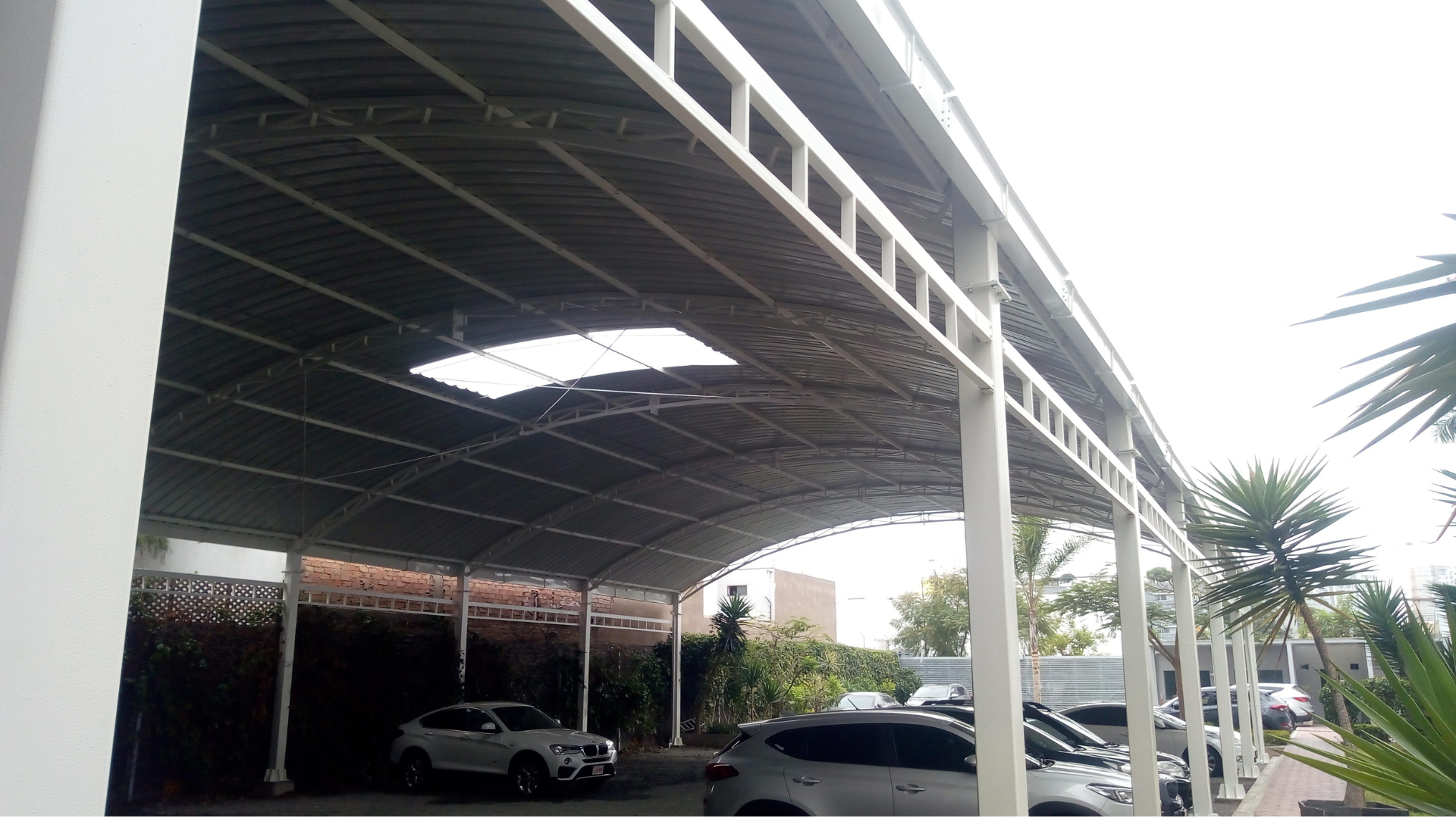 LA COBERTURA PARABÓLICA elaborada para el área exterior a las oficinas del edificio de la Embajada de la República de Corea es una estructura metálica curva diseñada para brindar protección actualmente a los vehículos ubicados en las áreas abiertas del establecimiento. Este tipo de cubierta se caracteriza por su forma arqueada, liviana y resistente, que permite una evacuación eficiente del agua de lluvia y aporta una estética moderna al entorno.