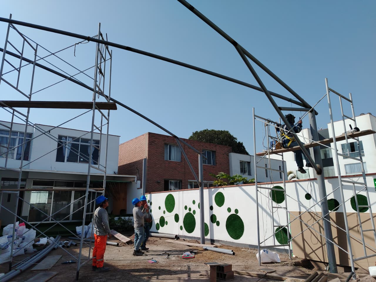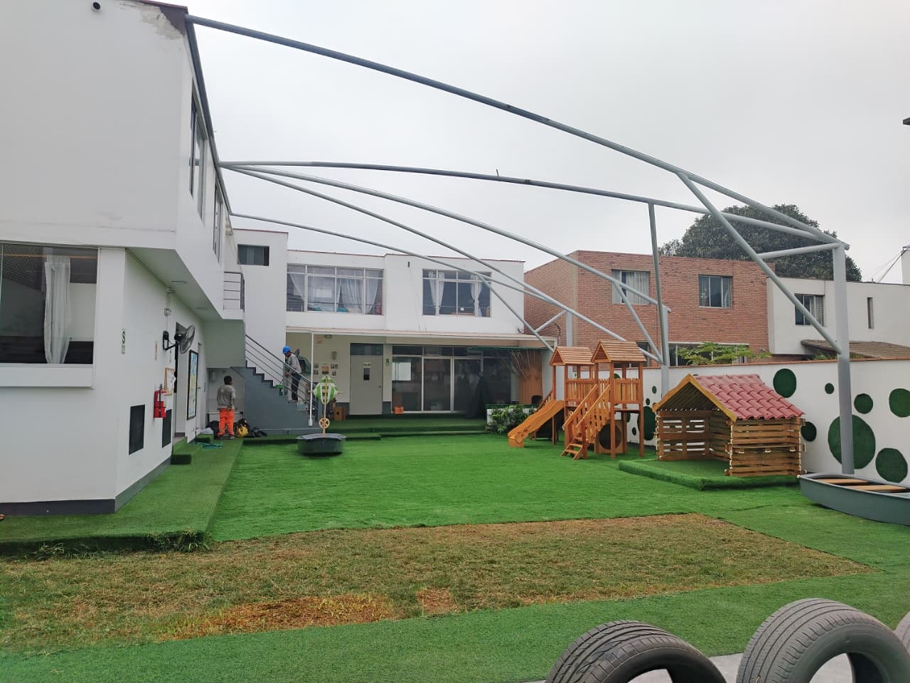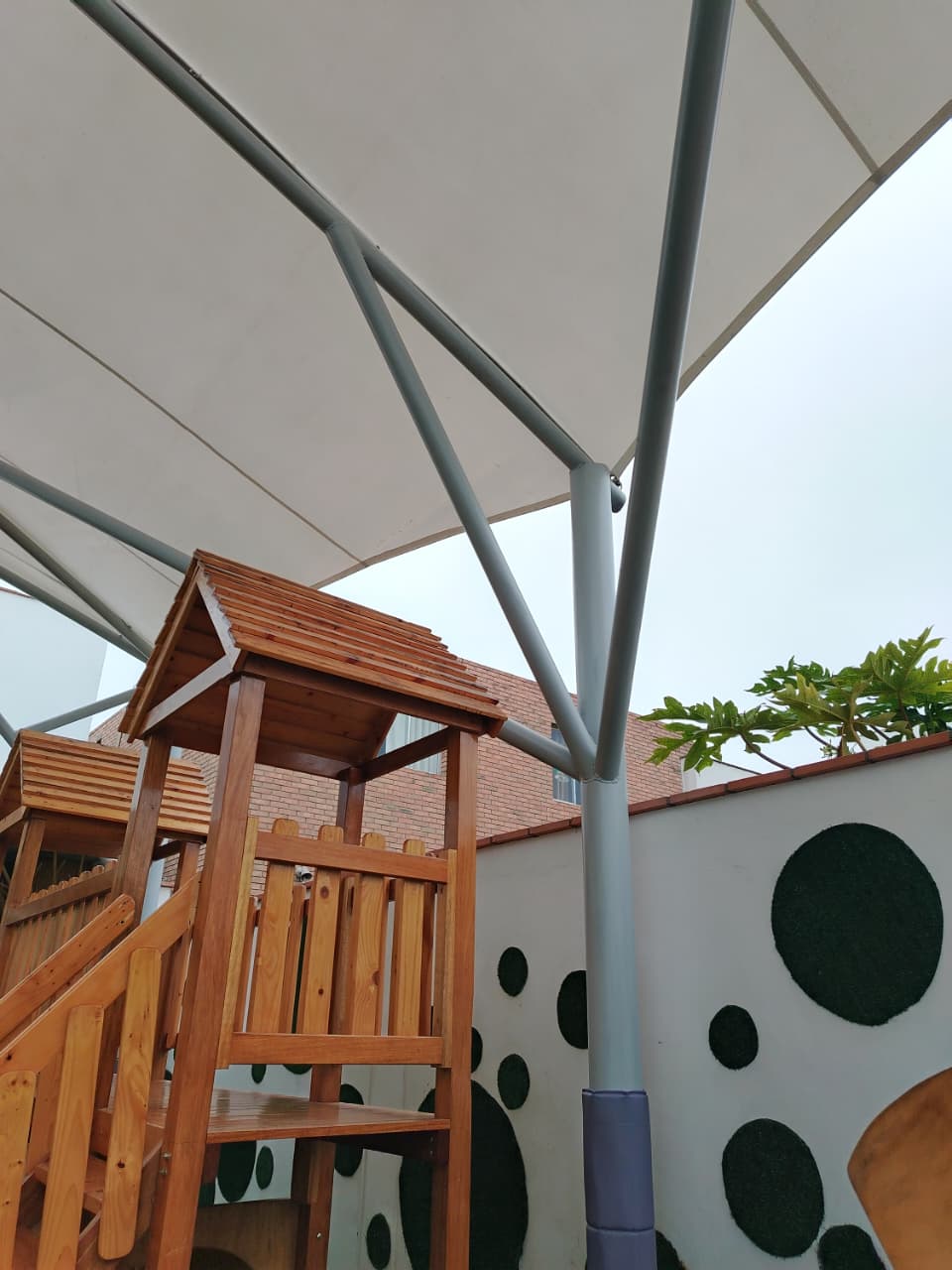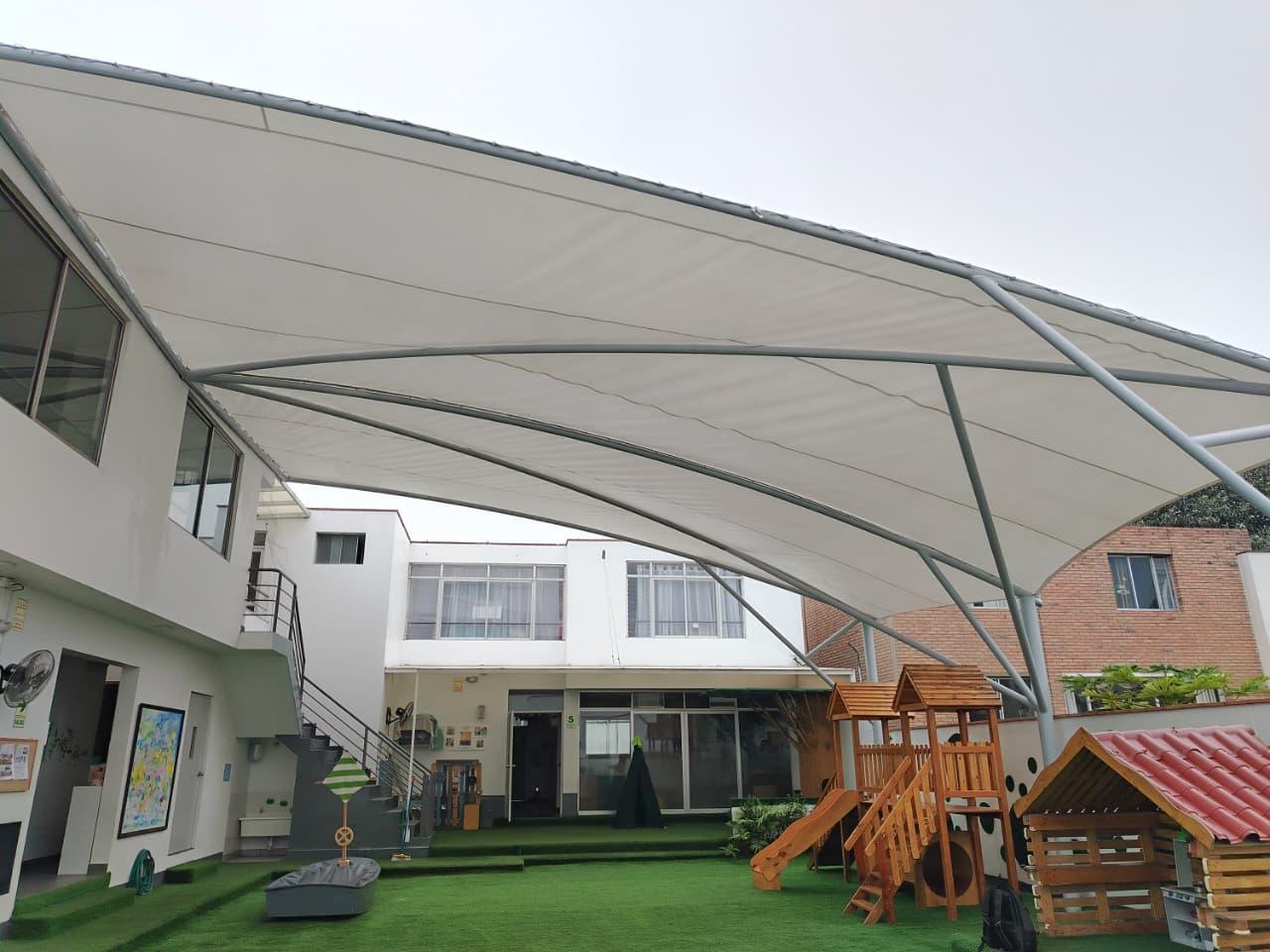 VILLA BAMBINO´S es un proyecto creado para un establecimiento educativo infantil ubicado en el distrito de San Borja. La instalación de esta estructura colocada en el área de juegos tuvo la finalidad de brindar protección parcial contra los cambios climáticos presentados hoy en día, permitiendo al mismo tiempo la ventilación y el ingreso de luz natural. Este sistema contribuirá a mejorar las condiciones de seguridad y confort térmico para los niños durante sus actividades al aire libre.