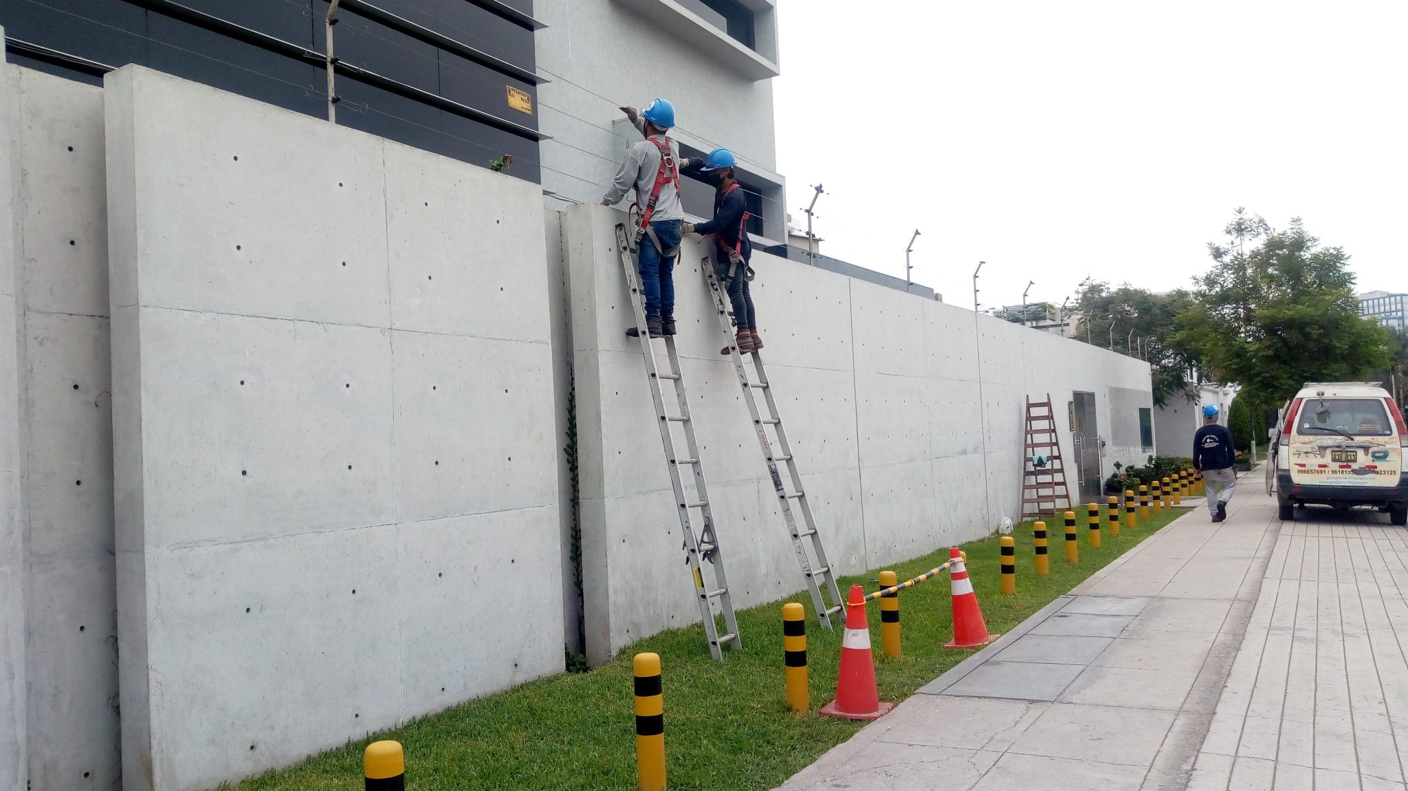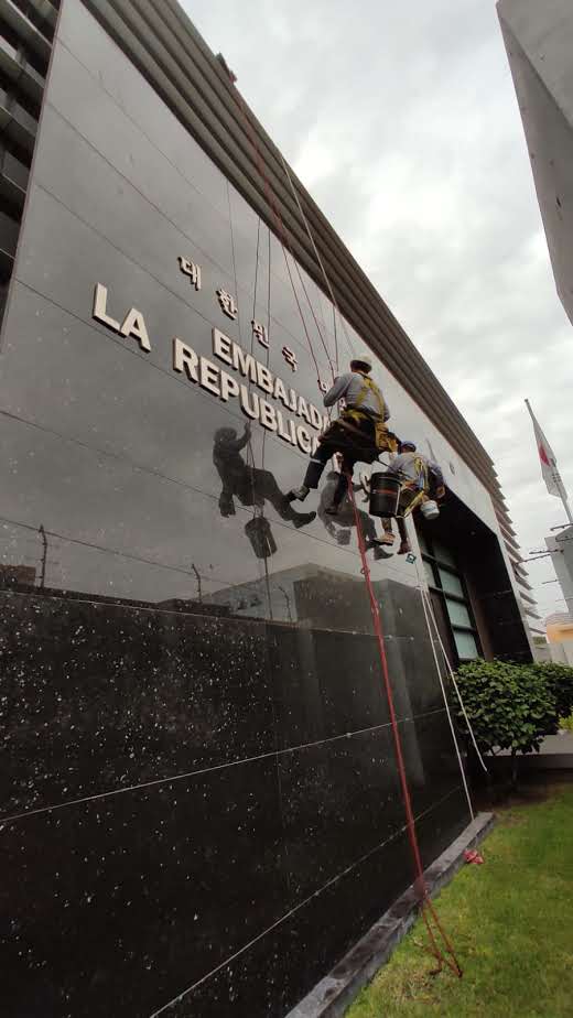 El trabajo realizado al edificio de las oficinas de la Embajada de la República de Corea consistió en el mantenimiento de la fachada tanto revestimiento como vidrios ya que debido a la exposición constante a agentes climáticos y contaminantes ambientales, es fundamental implementar un plan de mantenimiento periódico para garantizar la funcionalidad y seguridad estructural, por ello nuestro equipo de especialistas realizaron el Lavado superficial con productos neutros no abrasivos para evitar deterioro del vidrio o corrosión de perfiles metálicos y la eliminación de residuos orgánicos, sedimentos o contaminantes adheridos, adicional a ello el mantenimiento del revestimiento exterior de material granito y el repintados de los elementos de madera como marcos y puertas.